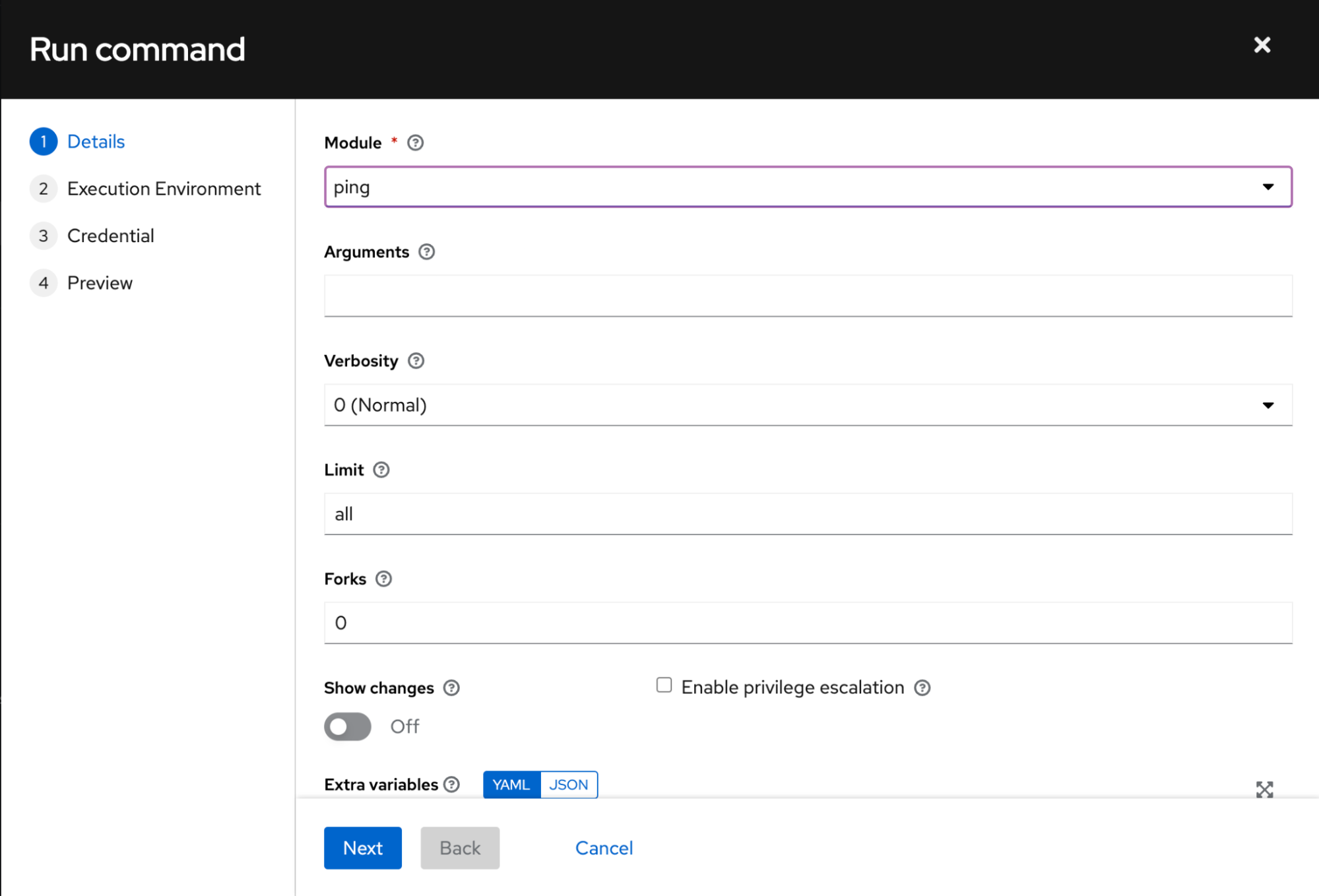 vim /path/to/exec/bundle/10.10.0.2_install_bundle/inventory.yml- Change the user field so that it contains the SSH user for the execution node.