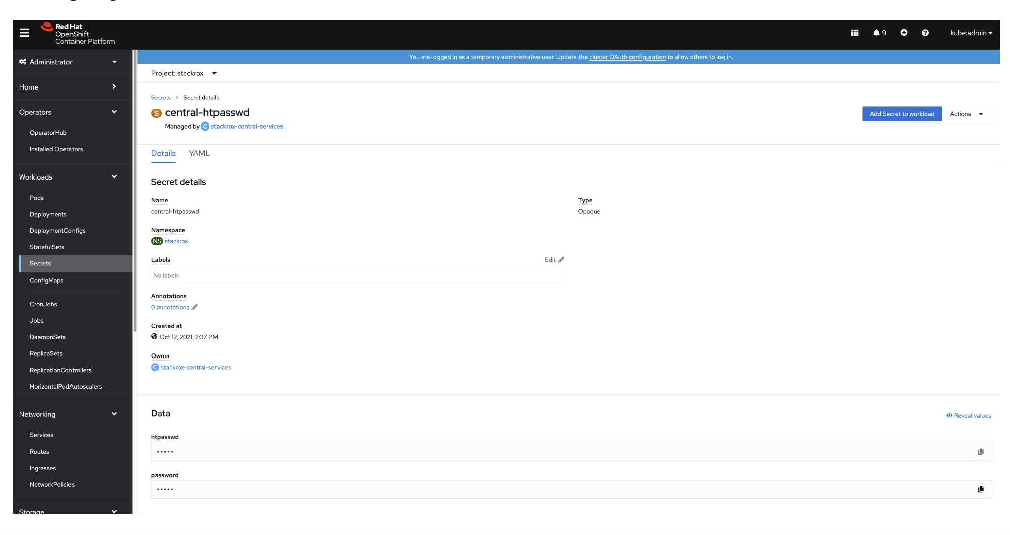 stackroxso you only see the stackrox secrets. Select the secret namedcentral-htpasswd. Look for the field namedpasswordin the Data section, and select the image to copy the password to your clipboard. Paste this value into the password field of the Central server login prompt.
