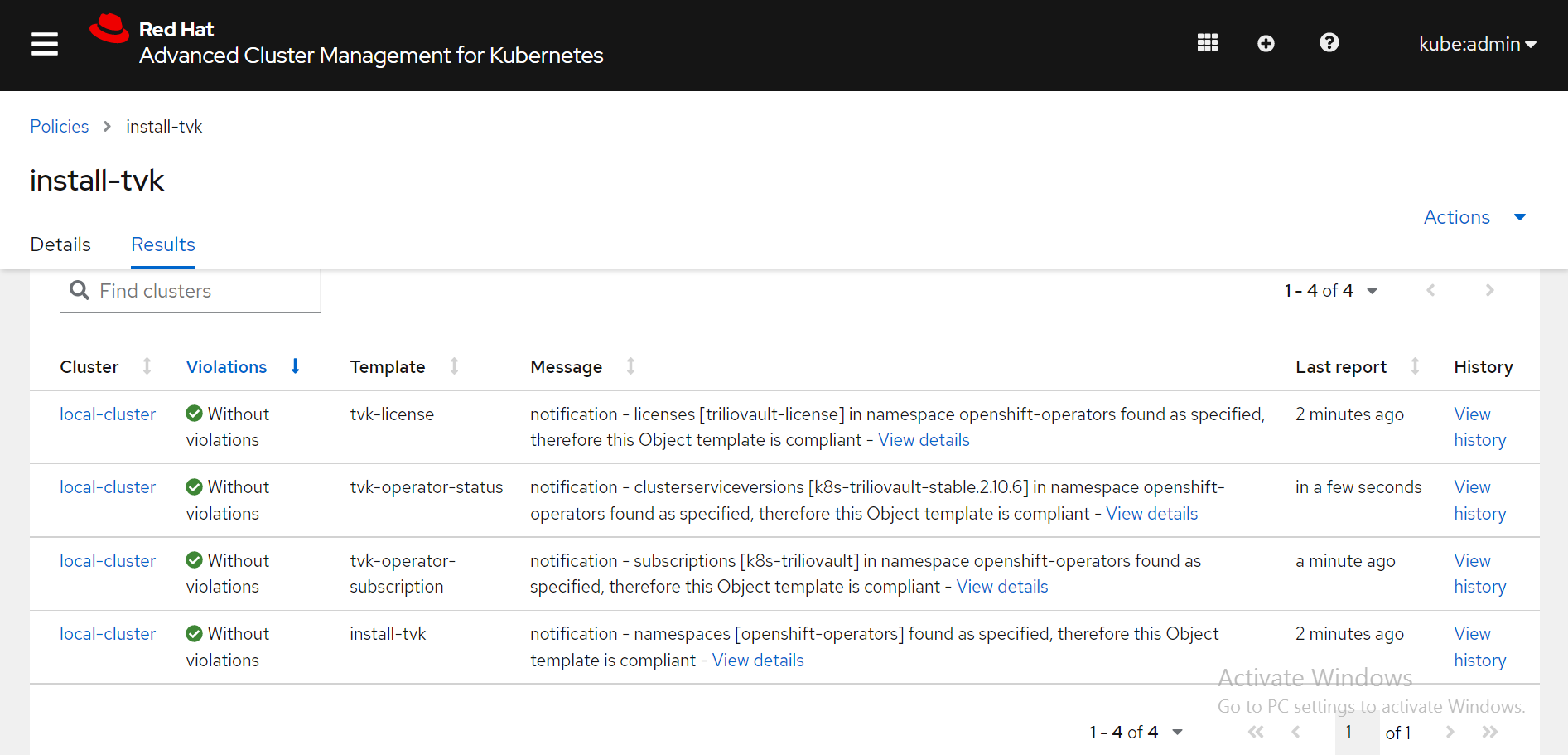 It is verified that TVK is not installed, so let’s create the policy by clicking the Submit button in the Create policy dialog box. After a couple of moments, the policy is listed in the policy table. Notice that there is a cluster violation. Select the install-tvk policy to view the policy details and results. View the following image: