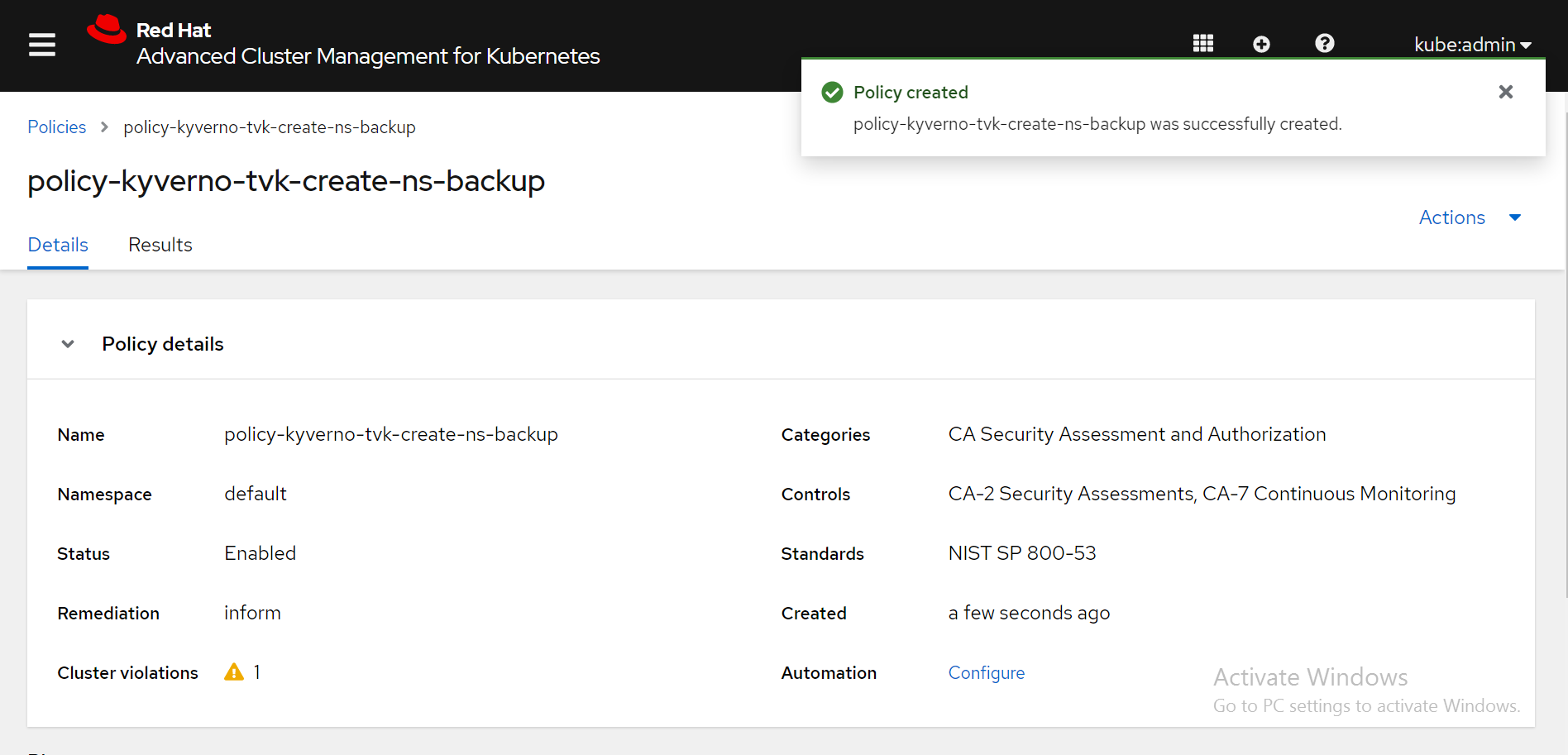 It takes a few minutes for the policy to be enforced. Select the policy name to see the details and results. Select the Results tab to view the cluster violations. Based on the following image, there are no longer any violations: