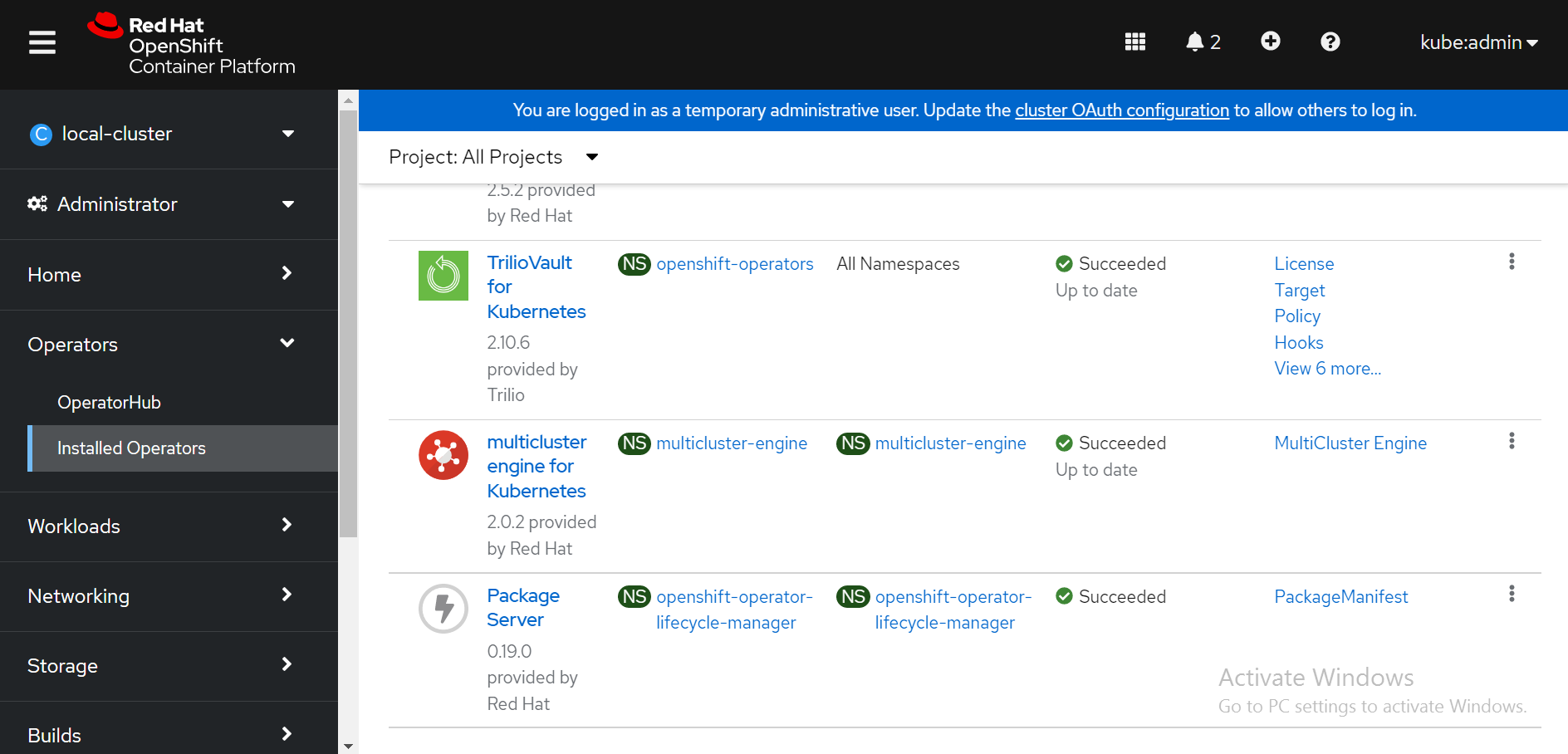 Before you create the policy, let’s verify that TVK is not installed. Recheck the list of installed operators on the cluster itself, from the OpenShift console: