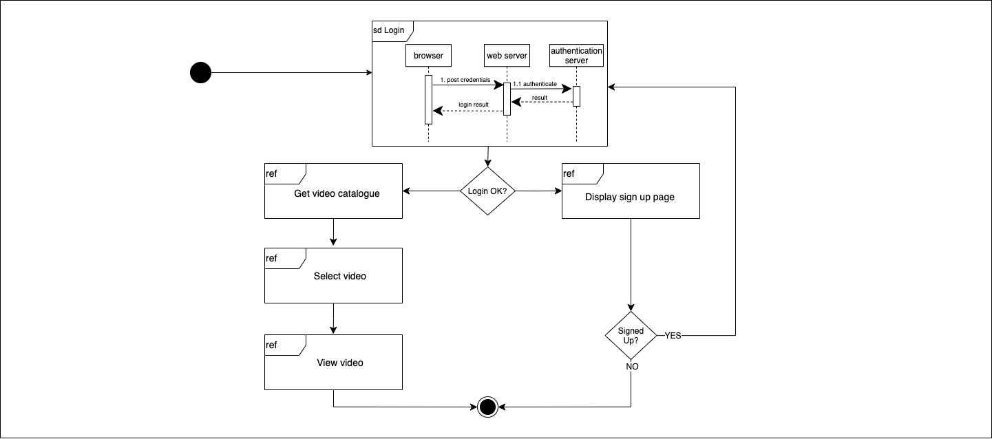 The interaction for Login is defined with an sd prefix. Thus, it provides a good amount of details about the Login process. The other interactions are defined with the ref label. These interaction frames describe what the interaction does, but not how it does it. Those details are defined in other diagrams.