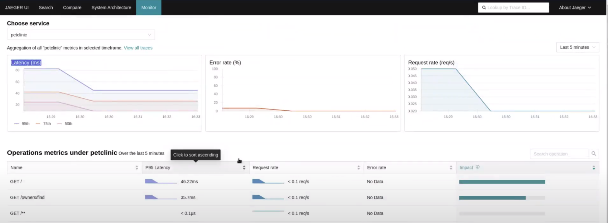 Monitor tab in the Jaeger user interface, installed by the Tempo operator