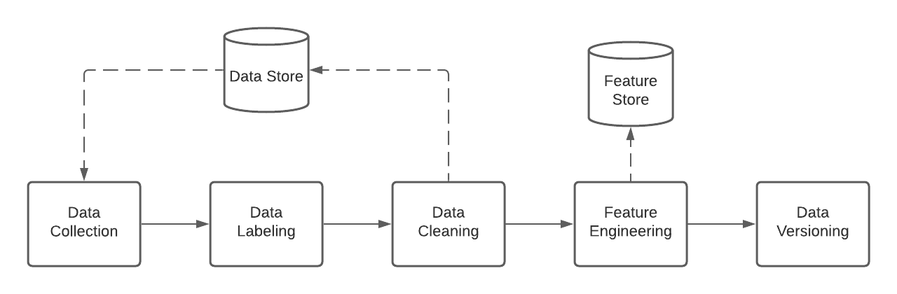 The first step is data collection in which the source data is loaded from or queried against a database or data lake (for example, a SQL database or HDFS/S3). Note data collection may require joining multiple sources together to present a cohesive dataset. If possible, the data is labeled with tags that are relevant to the use case for supervised learning algorithms. (for example, image tags for classification or sentiment tags for analysis). Data is cleaned using normalization or deduplication.