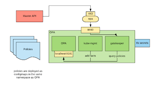 - Kube-mgmt: this component is responsible for watching for OpenShift resources and loading them in OPA as facts. Kube-mgmt is also responsible for loading policies into OPA. Policies can be specified as configmaps with a specific annotation.