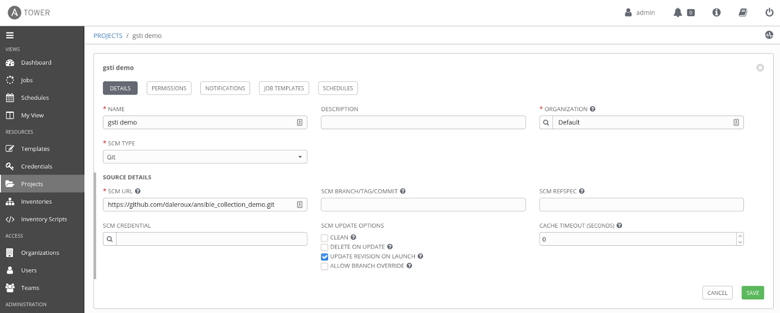 Now it's time to test things out and see if there's any failure from which we can learn. The following repository in my GitHub account contains an Ansible Playbook with a dependency on the previously uploaded Collection from Part 1. First, let's create a project in Ansible Tower, whose source will be this GitHub repository. Next, in the left frame under ‘Resources’, click 'Projects.' Since the GitHub repository is public, it doesn't require any credentials; we can simply fill in the different fields as below, then click 'Save.'
