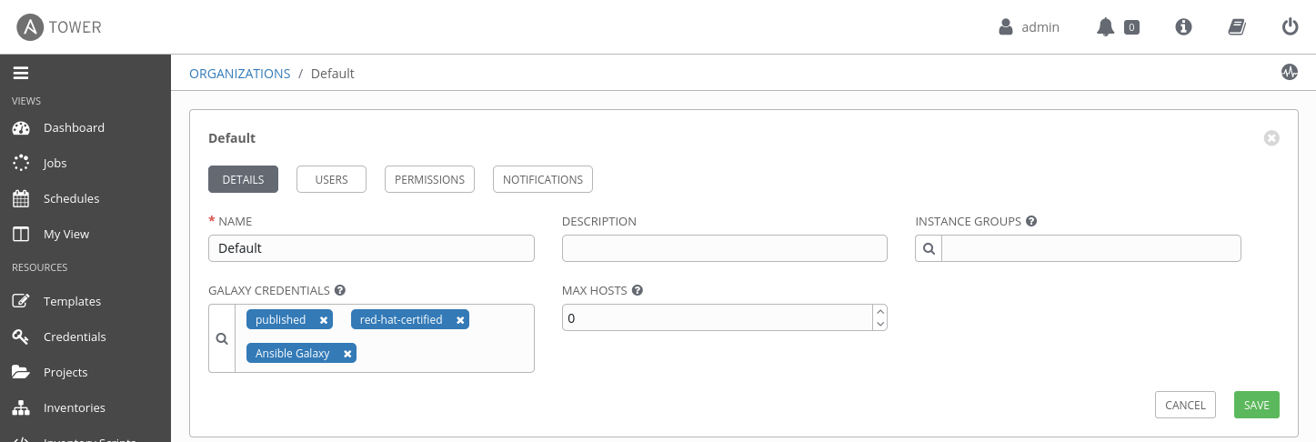 In the present case, it's important to note the Collection 'daleroux.hello_tam_blog' on which the playbook depends, exists in two places: in the private Automation Hub where I uploaded it previously, and in Ansible Galaxy. Therefore to validate that Ansible Tower will search for Collections in private Automation Hub, we will remove Ansible Galaxy from the 'Galaxy Credentials' in our default organization, leaving only :