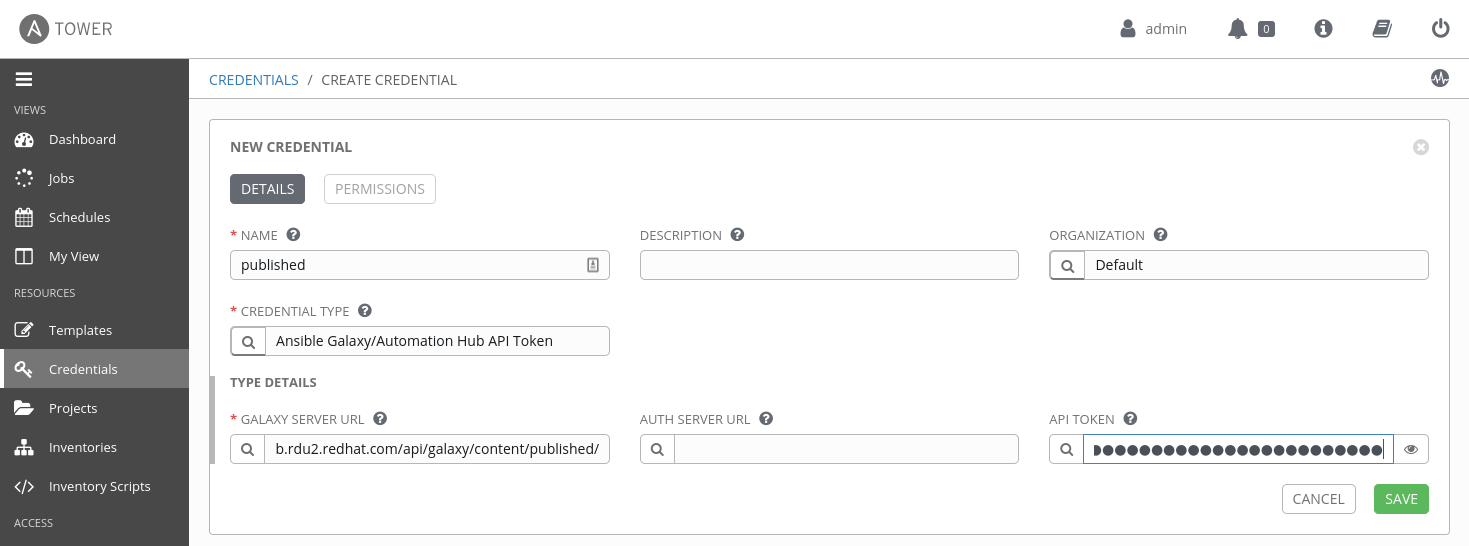 A particular type of credential: "Ansible Galaxy/Automation Hub API Token" is what allows Red Hat Ansible Tower to authenticate and connect to private Automation Hub. Logging into Ansible Tower's GUI, in the left frame under ‘Resources’, let's click on 'Credentials,' then 'Create a new credential'