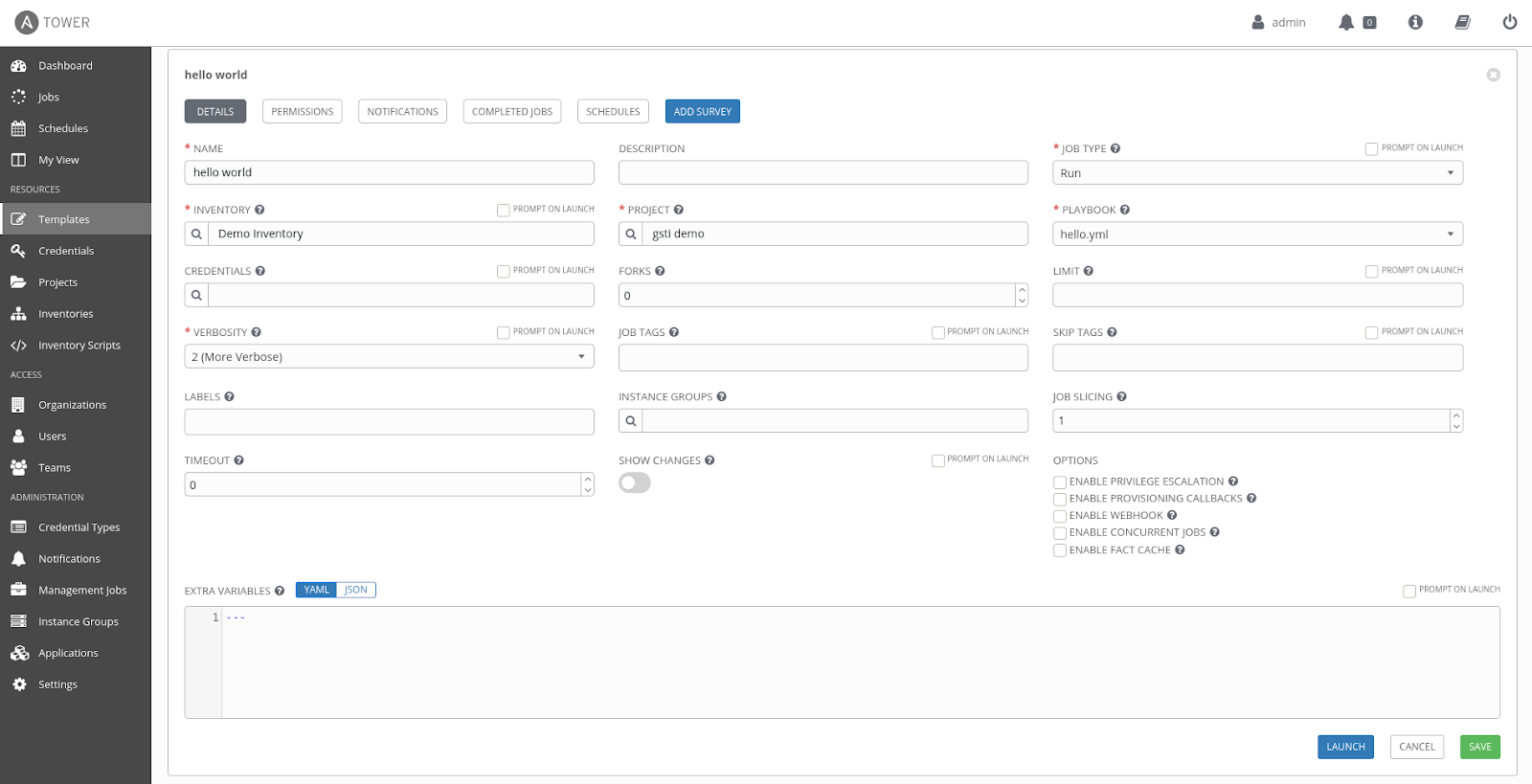The final step will be to create a job template from the project and to run it. To do so, click on 'Templates' in the left frame under ‘Resources’. Then, click on the plus sign and select 'Job Template.' In the present case, we will fill the information as can be seen here: