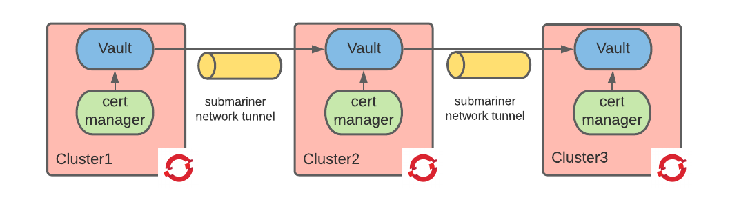 An interesting topic of note in this configuration is that each instance of cert-manager needs to authenticate to Vault to provision certificates. But from a Vault’s perspective, these cert-managers are different entities, as they each authenticate themselves via the Kubernetes authentication method using different service accounts (from different clusters).