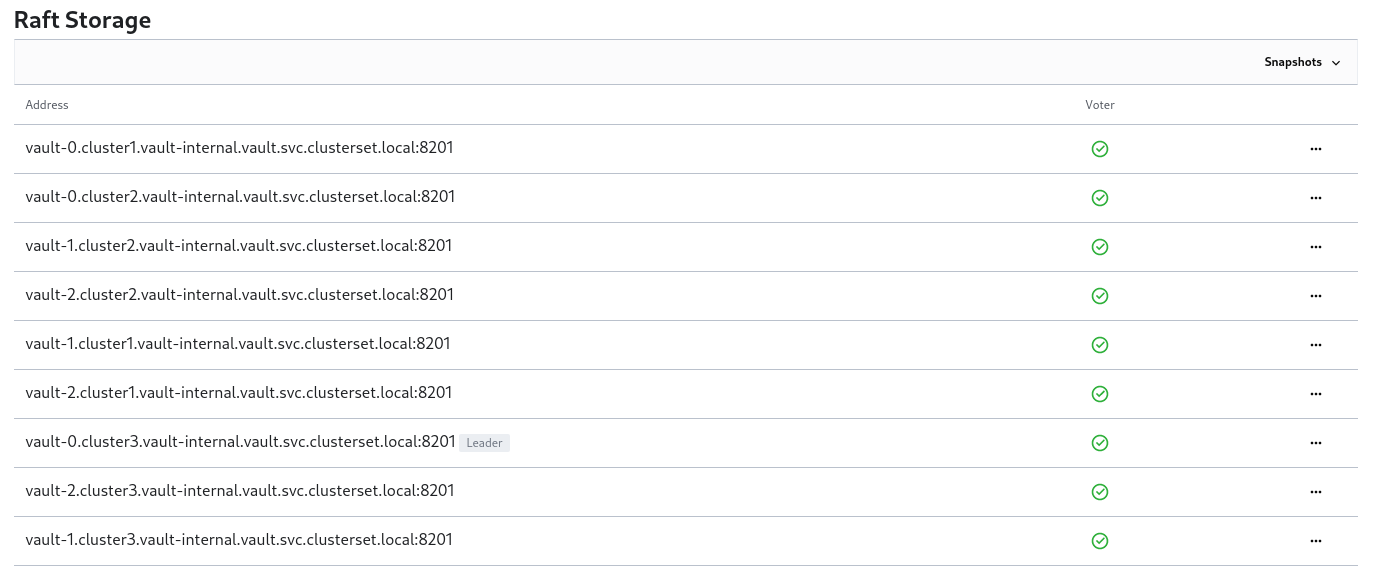 Once Vault is correctly initialized, you should see all the members joining the cluster, which can be verified from the web UI: