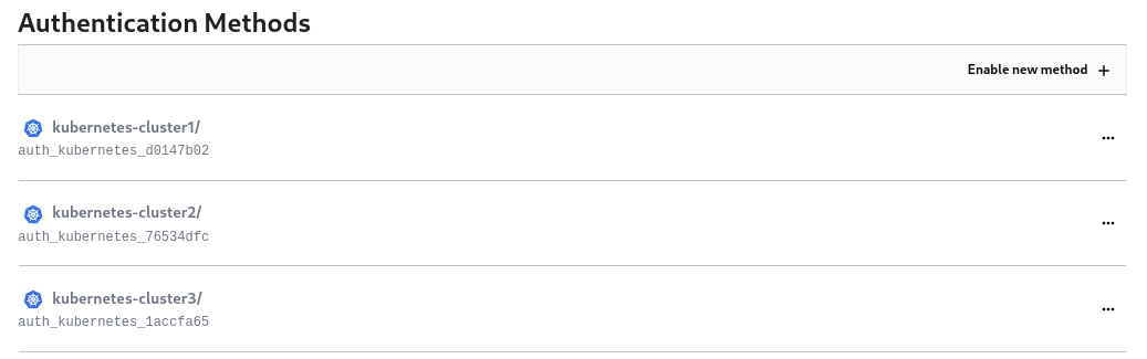 To solve this issue, three Kubernetes authentication endpoints (one per cluster) have been configured and can be seen from the Vault web UI: