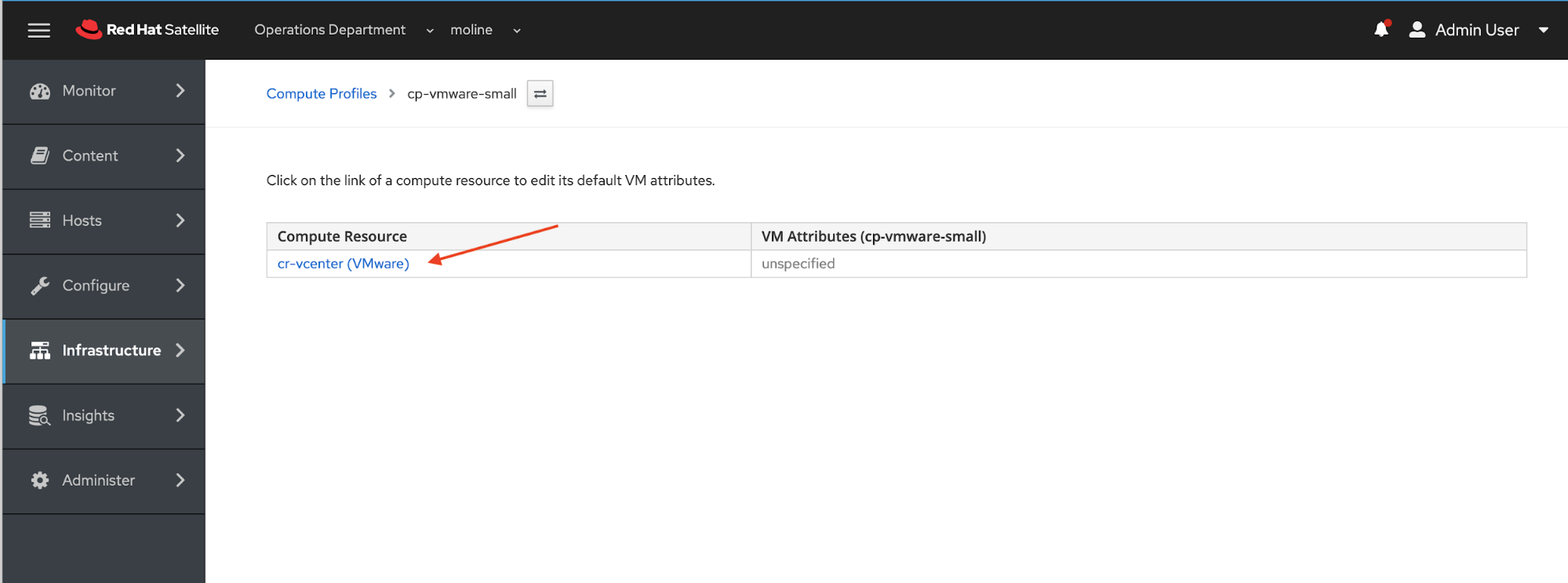 On the Compute Profiles > cp-vmware-small page click the cr-vcenter link to define the new compute profile cp-vmware-small.