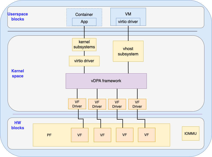The PF presents multiple VFs, the VF driver talks directly to the VF and presents vDPA devices to the vDPA framework. Users may choose to use the kernel virtio driver to serve containerized (or bare metal) applications via the kernel subsystem or the vhost subsystem for serving VMs.