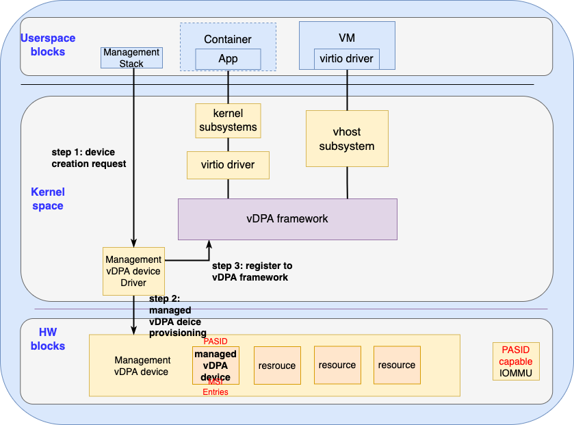 As shown in Figure 3, the kernel will allocate a unique address space ID (PASID for PCI devices) for each managed vDPA device. Such PASID will be assigned to each managed vDPA device by the Management vDPA device driver during the provisioning. The managed vDPA device will use its own PASID with the requestor ID of the management vDPA device for the PCIe transactions for DMA.