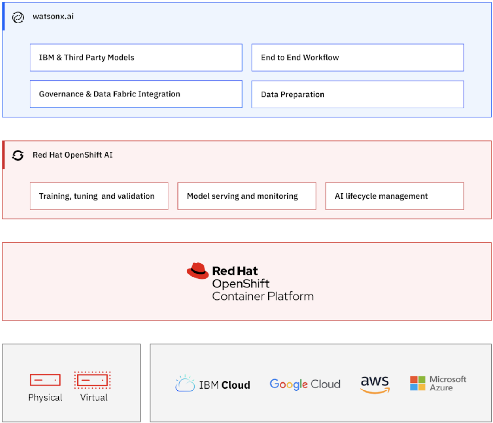 The watsonx platform enables customers to scale and accelerate the adoption and impact of AI with a full technology stack, AI, trusted data and governance, and flexibility across clouds and on-premises environments by being built on top of Red Hat OpenShift. The watsonx platform has three core components: