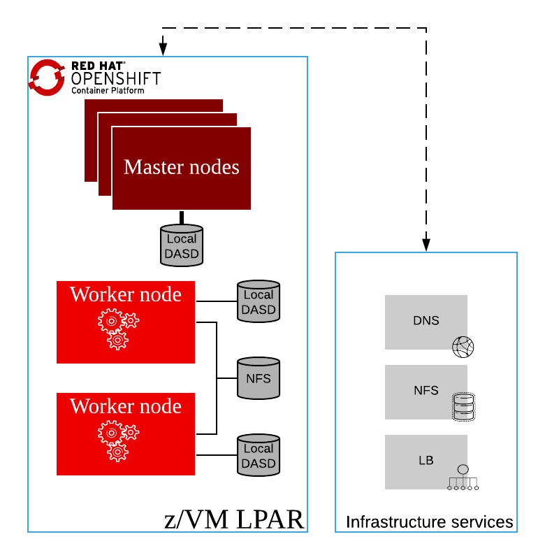 In this article a Red Hat OpenShift cluster has been deployed in 5 z/VM guests running in a Mainframe. Each environment has a different setup, some requirements have to be met and the collaboration of other Mainframe teams (like networking, storage or virtualization) would be necessary to get the cluster up and running in the Mainframe. Also, the configuration of some external services would be needed, if your IT environment already has them running you don’t need to create new ones. This blogpost showed how to create those services as an example but you can configure your corporate DNS server to meet OpenShift requirements and also you can use your existing load balancer like F5 or HAProxy to handle the load of the cluster.