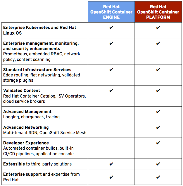 As our customer base has expanded, we’re heartened to see an increasing number of partners build integrated solutions with OpenShift in support of our hybrid-cloud approach to delivering enterprise Kubernetes. Simultaneously, we’ve learned from our CoreOS teammates that there is a segment of users who strongly prefer to use their existing infrastructure and developer tooling investments, which have often already been made through our ISV partners. These customers may not require all of the advanced capabilities that ship with OpenShift Container Platform, and to address their needs, today we’re announcing the availability of OpenShift Container Engine.