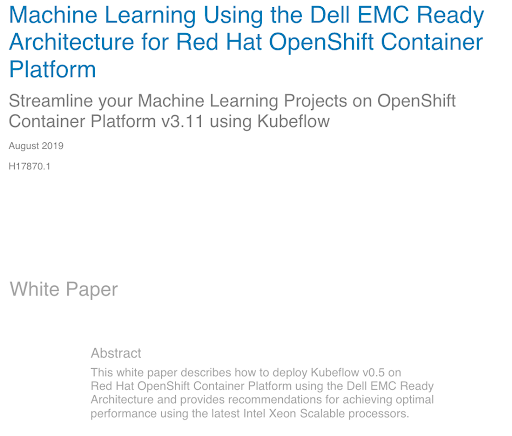 The first whitepaper is called “Machine Learning Using the Dell EMC Ready Architecture for Red Hat OpenShift Container Platform.” It describes how to deploy Kubeflow 0.5 and OpenShift Container Platform 3.11 on Dell PowerEdge servers. The paper builds on Dell’s Ready Architecture for OpenShift Container Platform 3.11 -- a prescriptive architecture for running OpenShift Container Platform on Dell hardware. It includes a bill of materials for ordering the exact servers, storage and switches used in the architecture. The machine learning whitepaper extends the ready architecture to include workload-specific recommendations and settings. It also includes instructions for configuring OpenShift and validating Kubeflow with a distributed TensorFlow training job.
