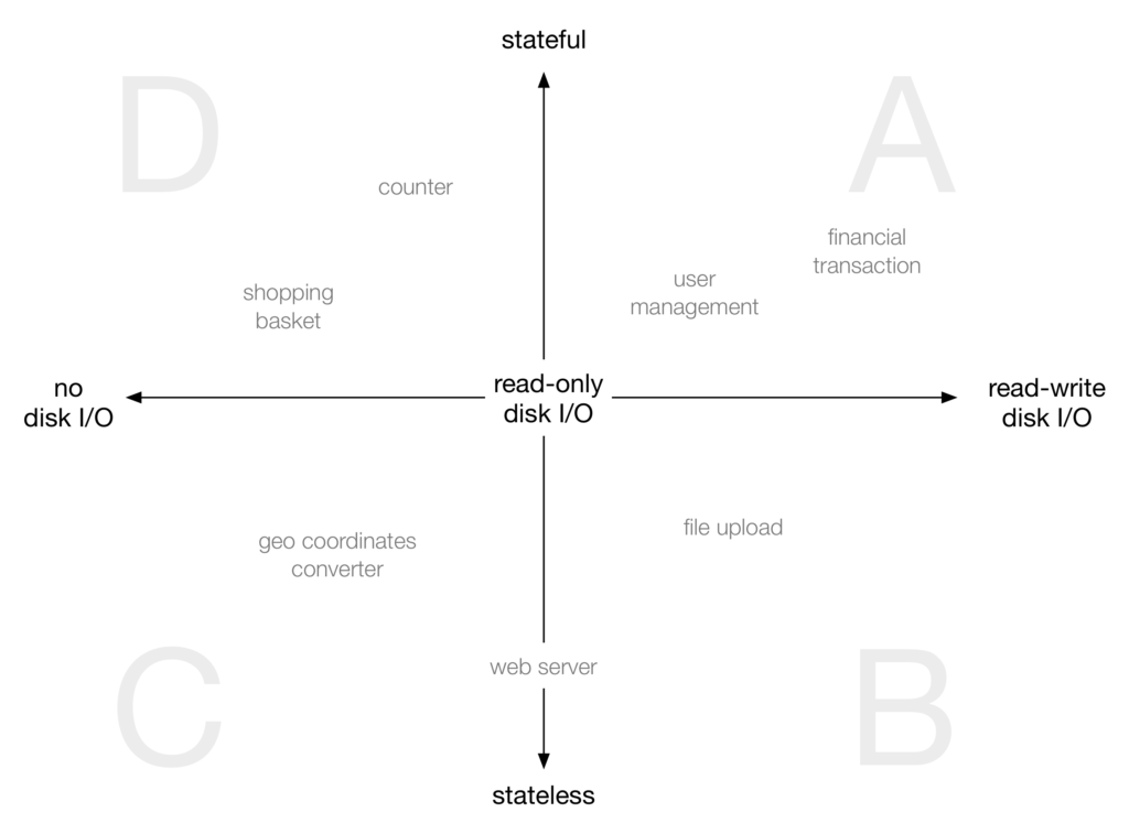 - Stateless applications without disk access (quadrant C), such as a converter services for geo coordinates.