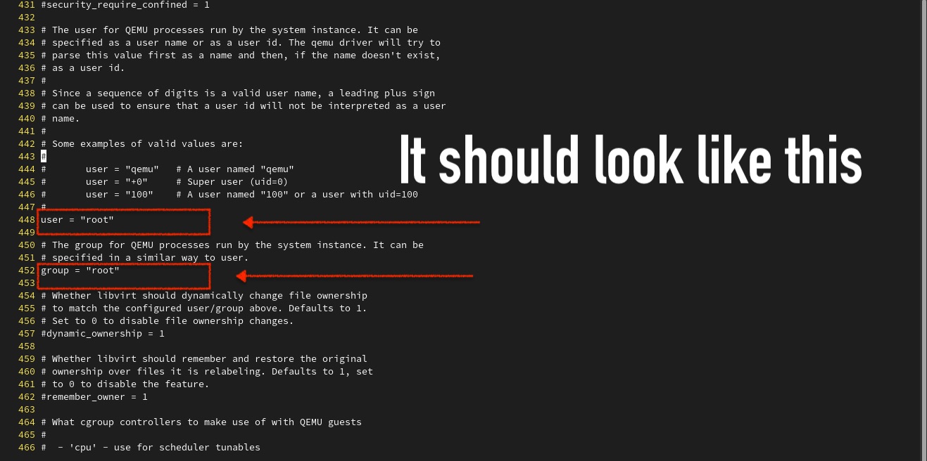 The easiest way I found that works for now is to change two properties in /etc/libvirt/qemu.conf. Let's display the content of the file with the following command: