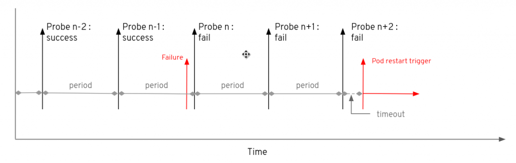 The example below illustrates the probe in action through a timeline. The first probe is successful, but the second, third and fourth fail. Assuming a default setting of 3 for the failureThreshold the pod will restart after the failure of the fourth probe.