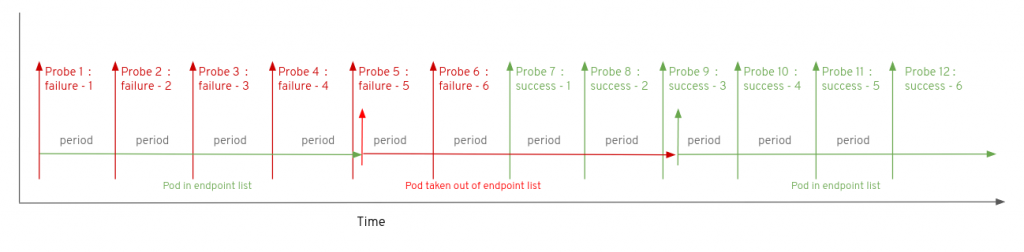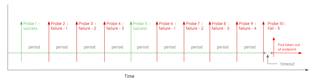 For a readiness probe, the failureThreshold parameter defines how many times the probe must fail before the pod is removed from the endpoint list. Consider the situation in which a readiness probe has a failureThreshold of 5 and a default successThreshold of 1. In the diagram below the pod suffers three consecutive failures to respond the to probe, followed by one successful response (probe 5). This successful response resets the counter on failures such that a further sequence of five failures occur (probes 6 to 10) before the removal of the pod from the endpoint list at probe 10.