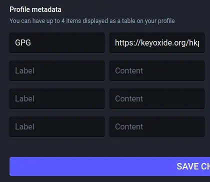 On the Edit profile page, scroll down to the Profile Metadata section. The Label field is arbitrary, so you can use terms like Verification or PGP or whatever you feel is appropriate.