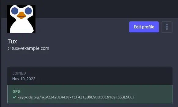 Now that you've set everything up, you can use Keyoxide as your verification link for Mastodon. Go to your Mastodon profile page and click the Edit profile link.