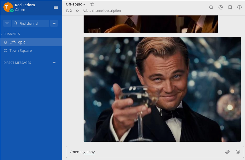 - Go to any available channels, and in the chat field, type /meme followed by a space; this will give you a list of available memes. I chose the Gatsy meme by typing /meme gatsby.