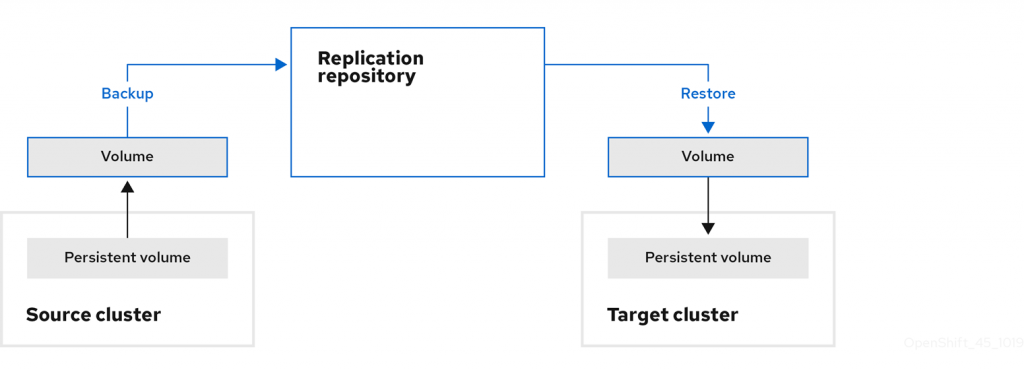 This is a two-step approach which can support all storage backends (default option). Your data is first copied on your replication repository and then restored on your target cluster. Your migration can be first "stage" to copy most of the data without any impact to your source cluster. Then, your can "migrate" which will only copy files that have been changed since your last staging, reducing the downtime significantly before the final cut-over.
