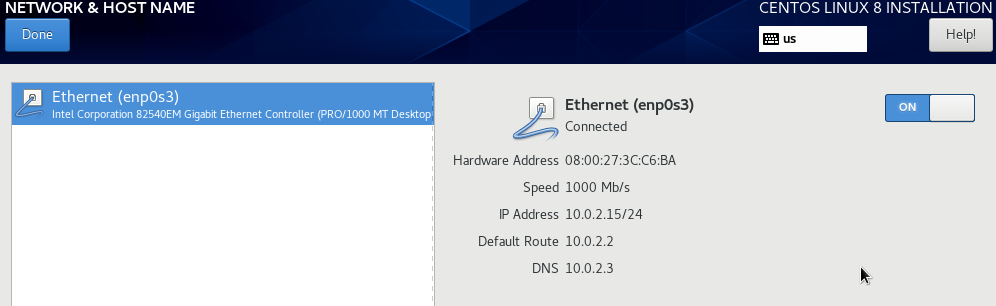 When you do this, the network information appears: IP address, Default Route, and DNS. These numbers were received from DHCP because when you move the Ethernet connection button to ON, the installer queries DHCP and registers the system with DHCP. DHCP is Dynamic Host Configuration Protocol. Your network is now configured and your system is connected to your local network and optionally, the internet.