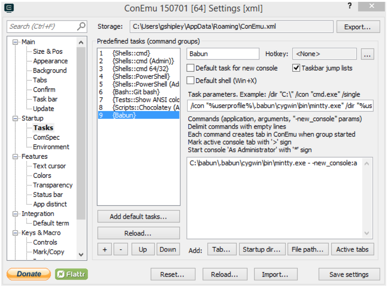 The default shell application window that ships as part of Babun is a little lacking when it comes to features. I much prefer a terminal that supports tabs, font resizing on the fly, etc etc. If you recall from my first Windows blog post, I truly enjoy using ConEmu. Luckily, it is a pretty easy task to use Babun as the default shell for ConEmu based sessions. To do this, open up the settings window of ConEmu and select Tasks located under the Startup section. This is shown in the following image: