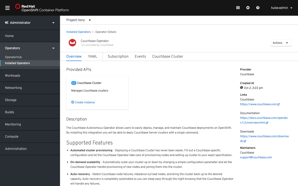 We can create CouchbaseCluster instance via the “Installed Operator” view: