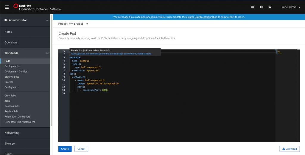 Through our built-in YAML editor, users can create and edit resources right in the Red Hat OpenShift Web Console UI. In the latest release, we’ve upgraded our editor to include language server support.
