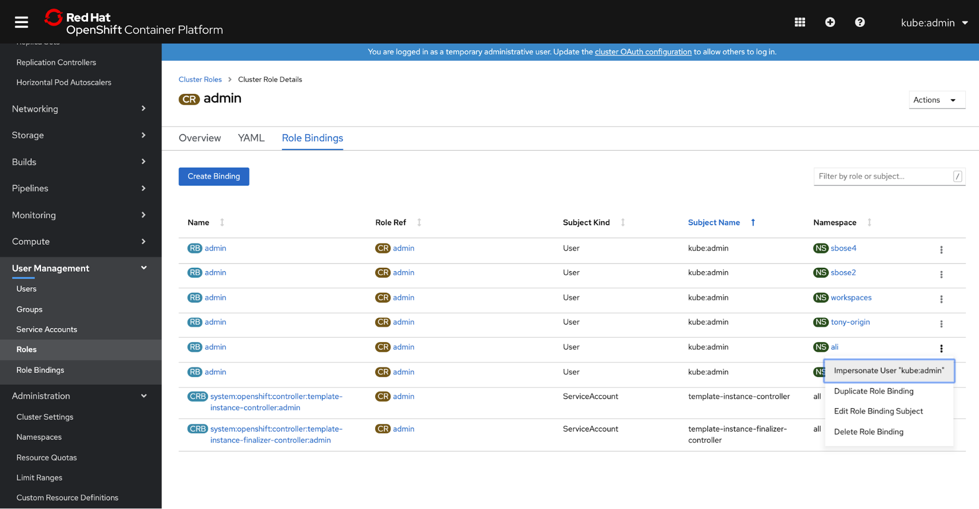 Users of Red Hat OpenShift have long had the ability to impersonate Role Bindings through the web console UI. However, since the addition of the user management section, users and administrators can now spoof other users and groups.