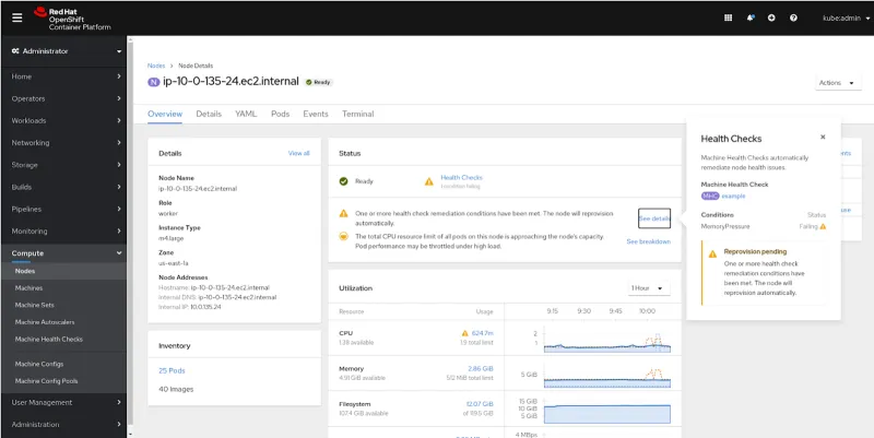 Similar to the Cluster and Project overviews that were introduced in previous OpenShift releases, the new Node Overview provides an at-a-glance view with critical data including Node Details, Inventory, Status, Utilization, and Activity.