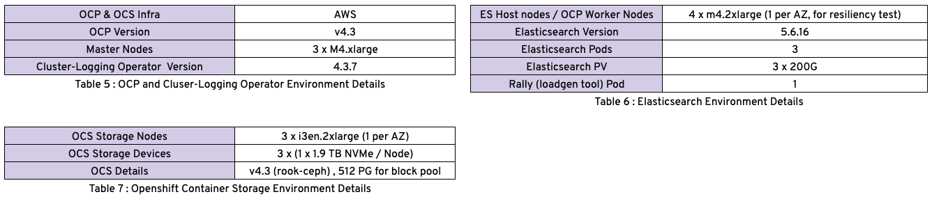 For this testing we used OpenShift 4.3 cluster for base infrastructure, OpenShift Container Storage 4.3 / EBS for storage and Cluster Logging operator for logstor (Elasticsearch) component. The cluster logging operator, logstor was re-configured multiple times with different storage classes and redundancy policies, as described in Table 2. Each Elasticsearch pod was provided with 1 x 200GB PV. For workload generation we used rally tool with up to two instances. We ran a myriad of test combinations where we modulated different settings including replication factor, ES shards count and storage class backends. The results shown above depict the results in each category across various tests.