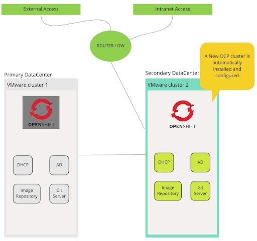 A new OpenShift cluster is created in the secondary datacenter. The connectivity change between the primary and secondary Datacenter is a manual operation, but it can be fully automated.