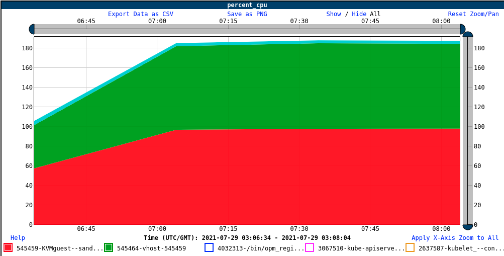 On the host, we are seeing the KVM guest consuming about 280% of one core, so there is a lot of overhead, but nowhere near the number of cores in the guest (nine) or the CPU limit (eight). Looking closer, we see the vhost consuming close to 90% of one core: