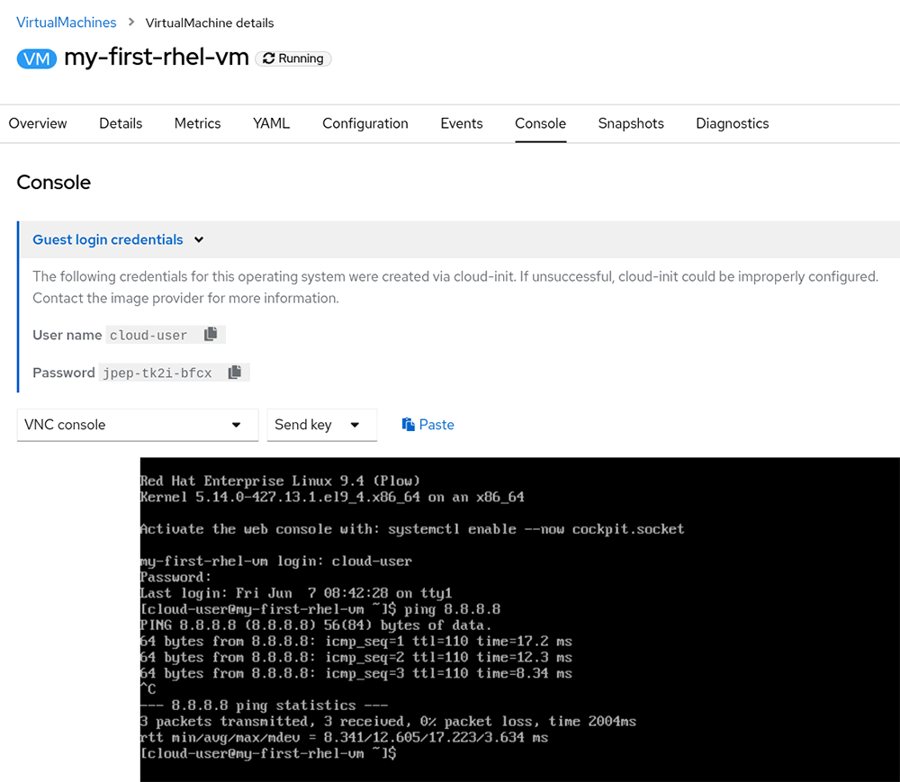 A few seconds after creating the VM in OpenShift Virtualization, your new virtual machine is ready to go.