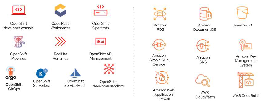 Access to fully integrated tools means that your team can focus on building innovative applications instead of building and maintaining their own application platform. The graphic below shows some of the developer and management tools your DevOps teams can use from AWS and OpenShift.