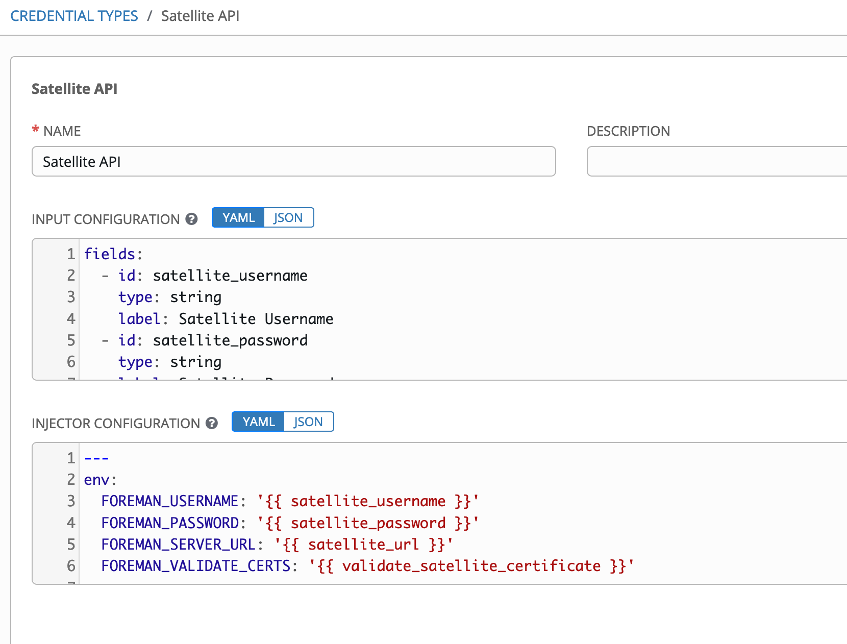 Now, let’s set up a custom credential type that we can use to securely store some connection information for our satellite. First, we’ll define our input configuration: