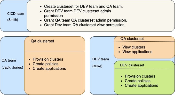 CICD team creates cluster set for DEV and QA team, grants dev-clusterset admin permission to DEV team, grants qa-clusterset admin permission to QA team, grants qa-clusterset view permission to DEV team.