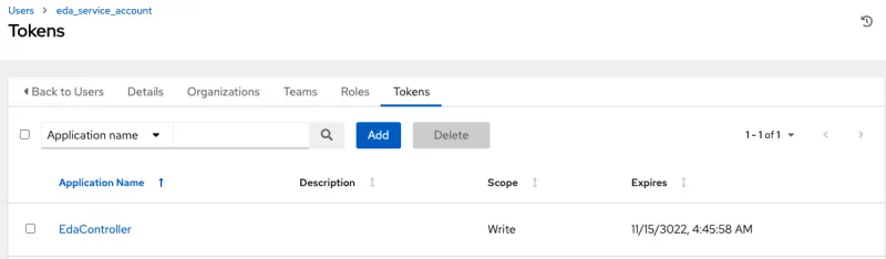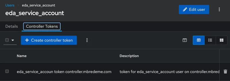 Because our rulebook action is to launch a job template in automation controller, we must create a Controller Token that can be used to authenticate our Event-Driven Ansible controller service account (detailed in this documentation).