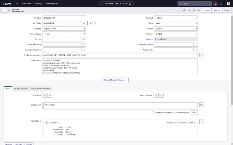 In this article, we explore how to get, configure and use the Red Hat Insights collection for Event-Driven Ansible, and provide an end-to-end example of an automation flow using Ansible Automation Platform and its Event-Driven Ansible functionality. Our goal is to automate the creation of a ServiceNow incident ticket with all relevant information when malware is detected by Insights on one of our Red Hat Enterprise Linux (RHEL) systems. We show how we can track and audit all automation from the Event-Driven Ansible controller as part of Ansible Automation Platform.