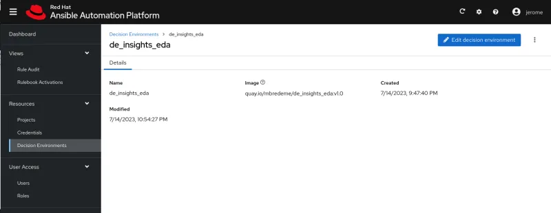 At this point, we can follow the Event-Driven Ansible controller user guide to configure our project and decision environment for our example.