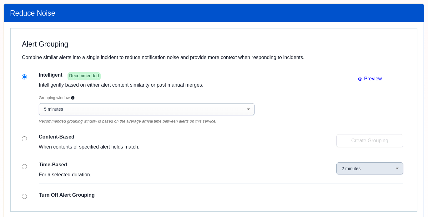 Lastly, we recommend using the intelligent grouping functionality from PagerDuty set with a window of five minutes to automatically group all related alerts in one incident. This is handy for dealing with different events generated from the same RHEL system as part of one PagerDuty incident.