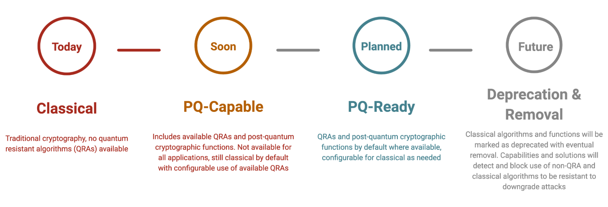 For the purposes of these phases, references to post-quantum cryptographic functions are inclusive of quantum-resistant algorithms, which may be symmetric or asymmetric but still subject to approval by the aforementioned standards bodies.