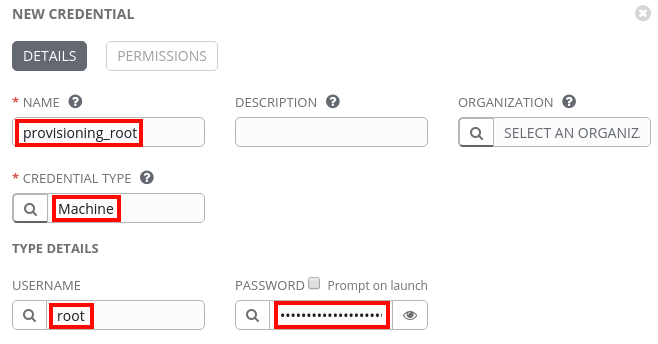 An Ansible Tower machine credential is created for the root user, with the same root password defined in the existing Satellite host group used for provisioning. Ansible Tower will use this credential to authenticate to the newly provisioned host.